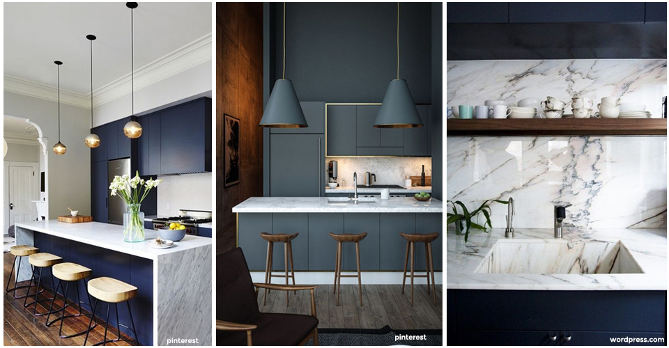 - Le mélange bleu et marbre. Ultra chic, le plan de travail en marbre vient rehausser la profondeur de la couleur, on est ultra fans